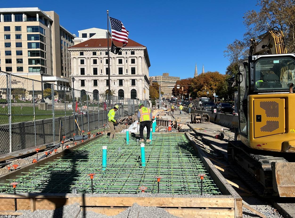 Construction in front of Soldiers and Sailors Memorial Hall on Fifth Avenue is progressing as the PRT contractor is preparing to pour a concrete slab for the new PRTX station.