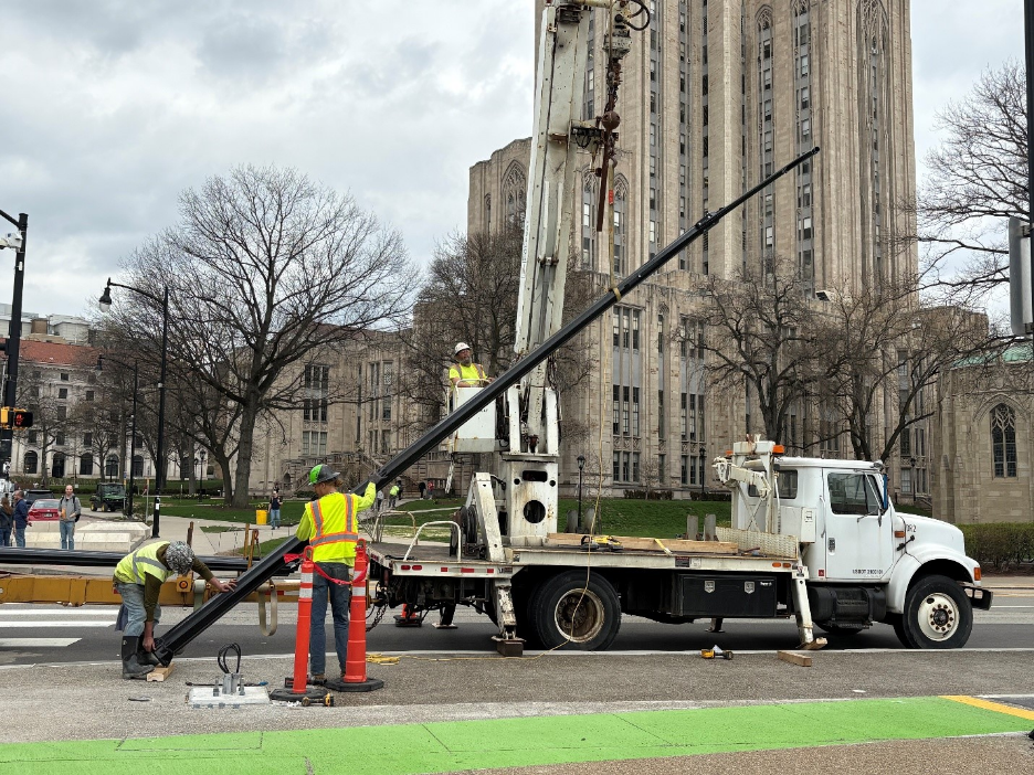Installation of traffic signal poles, pedestrian safety signal poles, and decorative lighting is underway throughout the University Line corridor of Fifth and Forbes avenues.