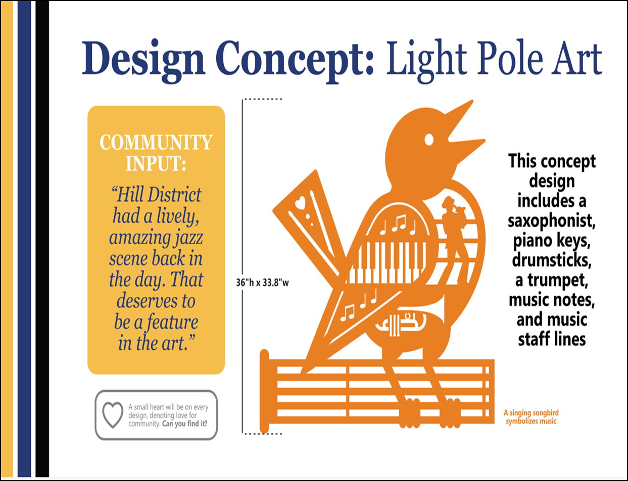 While Marsha has developed preliminary concepts, she is still seeking feedback on potential designs and locations. To participate, visit https://engage.pittsburghpa.gov/phad-projects/percent-art-university-line.