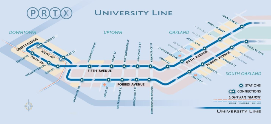 When construction for the University Line is complete, there will be 24 PRTX stations throughout Downtown, Uptown, and Oakland.