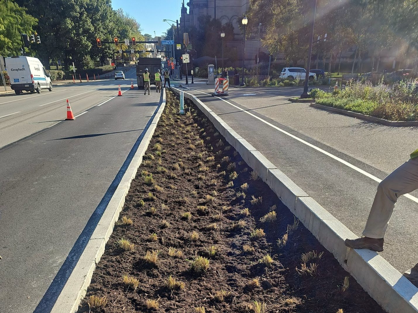 PRT’s contractor continues to install green infrastructure on Forbes Avenue at Jumonville Street in Uptown.