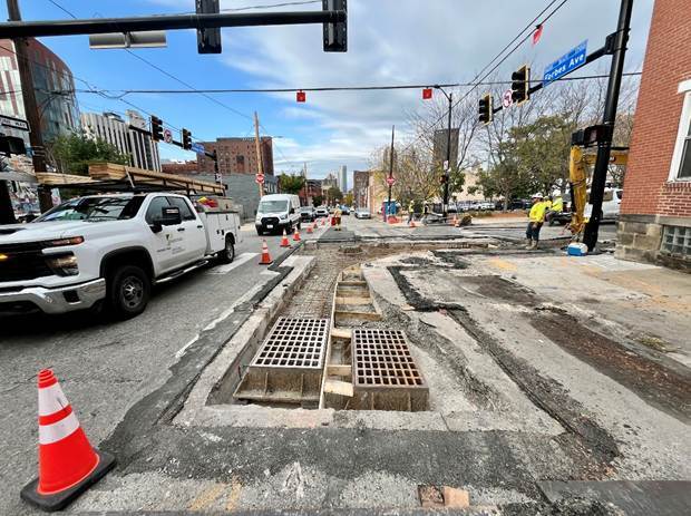 PRT’s contractor continues to relocate drainage infrastructure along both Forbes and Fifth avenues in Uptown. Stormwater inlet relocations are needed to match the new expanded sidewalks and curbs.