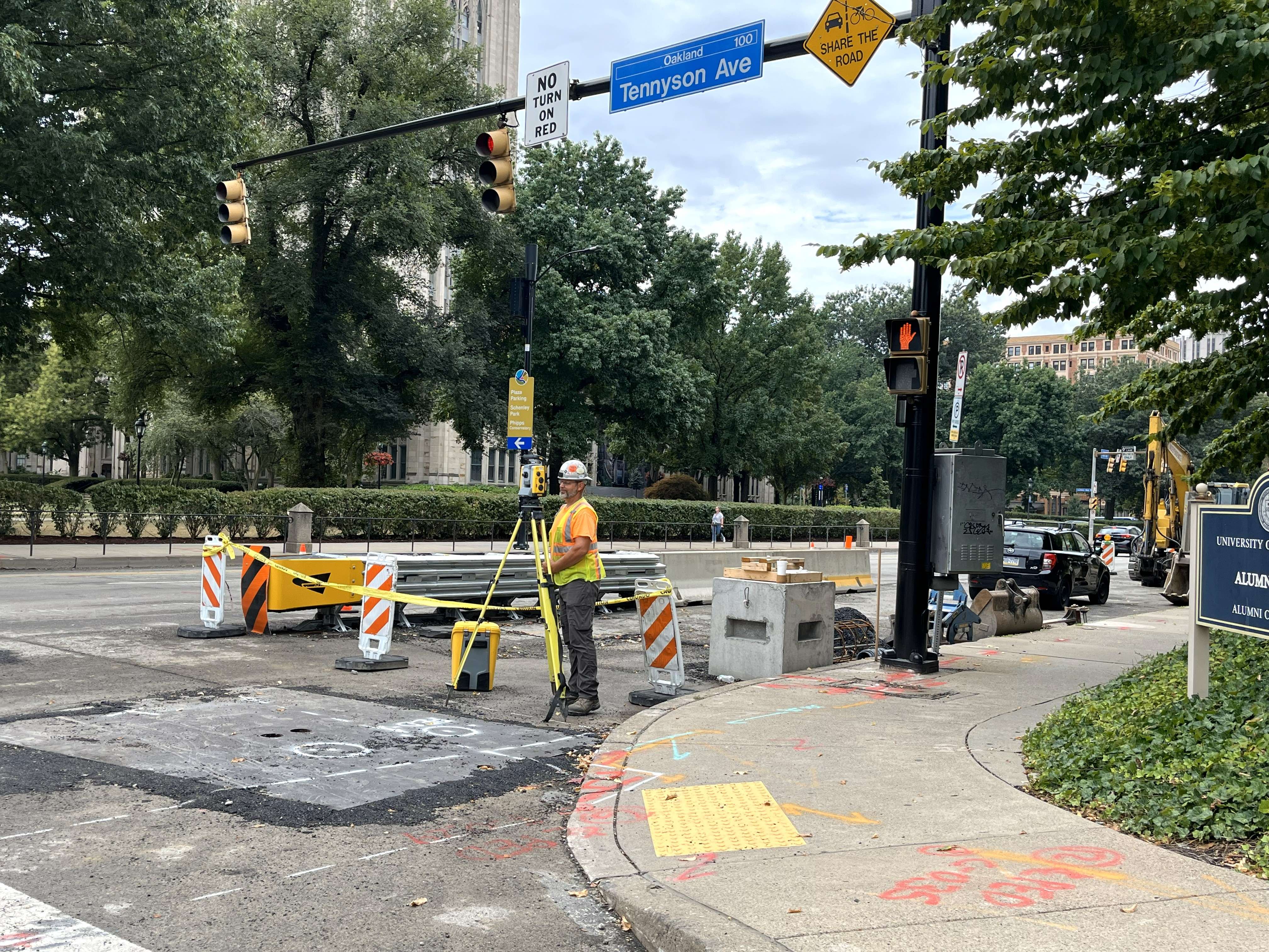 To prepare for construction activities at this location, the two concrete traffic islands on Fifth Avenue approaching Bellefield Avenue were permanently removed to allow for the better flow of traffic during and after construction. The contraflow bus lane and the pedestrian railing along Fifth Avenue will be permanently be removed as a bus lane in January 2026.